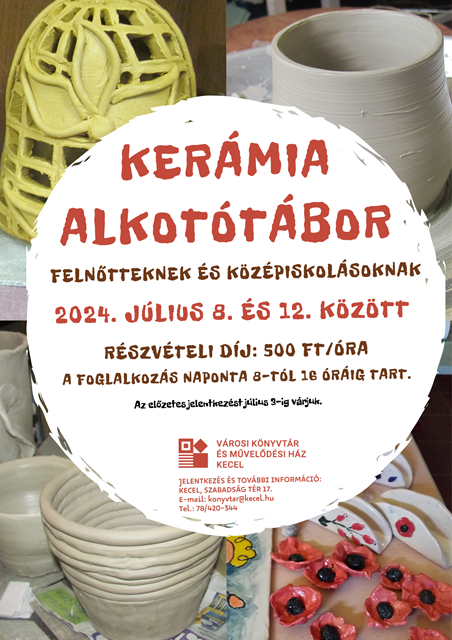 2024. július 8. és 12. között kerámia alkotótáborba várjuk a középiskolásokat és a felnőtteket. A foglalkozás naponta 8-tól 16 óráig tart.