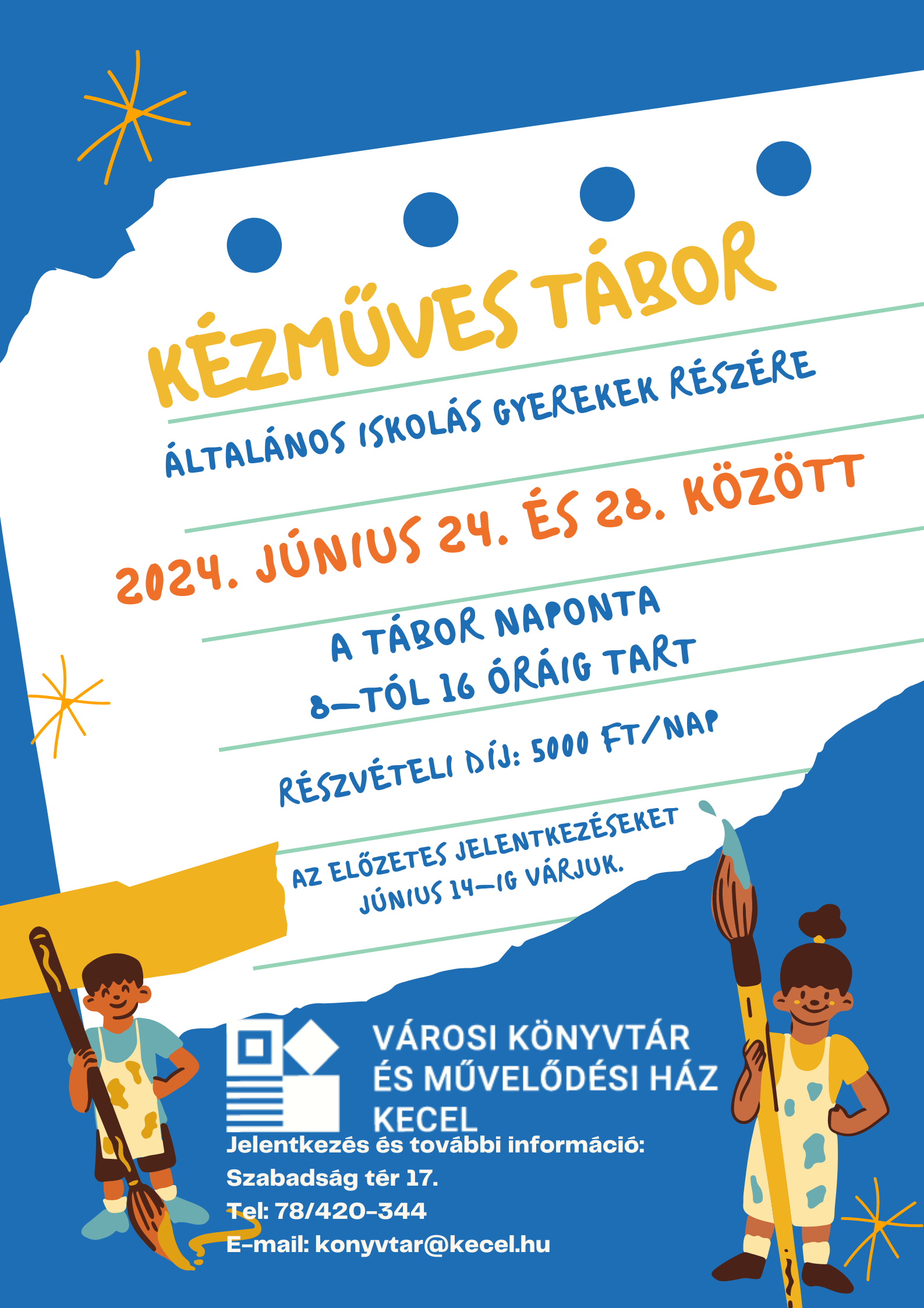 A kreativitást és a kézügyességet fejlesztő napközis táborunkba általános iskolás gyerekeket várunk 2024. június 24. és 28. között. A foglalkozások naponta 8-tól 16 óráig tartanak. Az öt nap alatt más-más kézműves tevékenységet próbálhatnak ki a gyerekek. Kirándulásaink során régi mesterségekkel is megismerkedhetnek. A különböző technikákhoz az eszközöket és az alapanyagokat biztosítjuk, az elkészített munkákat a nap végén mindenki hazaviheti.