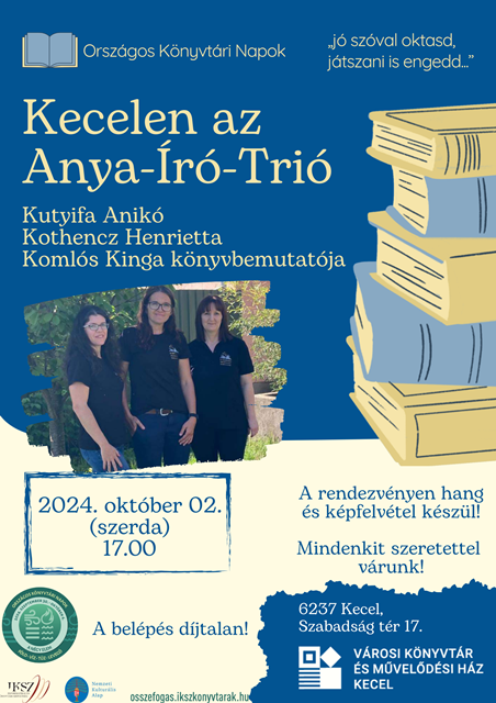 Az országos Könyvtári Napok rendezvénysorozat keretében október 2-án, 17 órától könyvtárunk vendége lesz három Kiskőrösön élő írónő, Kutyifa Anikó, Kothencz Henrietta és Komlós Kinga . Az alkotók az irodalmi beszélgetésen a műveik bemutatása mellett sok érdekes történetet is megosztanak a közönséggel.